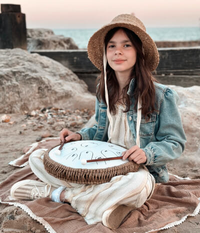 Grasp the drumsticks as demonstrated in the provided image. When you play the drum, make sure to strike primarily at its center. This technique is crucial for producing a clear and quality sound. Initially, if you hit the drum near its edges, as shown at the start of the instructions, you'll notice the sound is off-key and unpleasant.